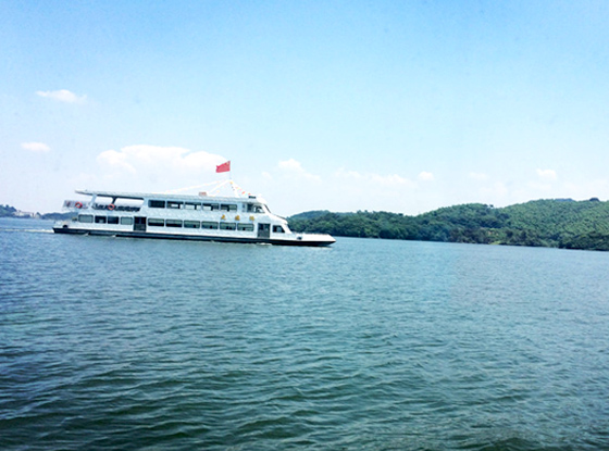 前往島上的途中我們盡享湖中美景,湖面在萬里晴空的映照下,一望無垠,波光粼粼,湖的周圍是綠蔭連綿的山,山水環(huán)繞真是美不勝收!